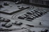 Жанровая фотография. Заснеженный автомобили на парковке у торгового центра.