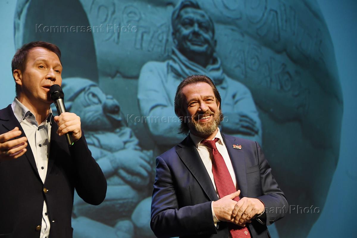 Церемония открытия скульптурной композиции "Атом Солнца Олега Табакова" скульптора Александра Рукавишникова, приуроченная к 85-летию со дня рождения артиста, Московском театре Олега Табакова. Художественный руководитель Государственного театра наций Евгений Миронов (слева) и художественный руководитель Московского театра Олега Табакова, актер, режиссер Владимир Машков (справа) на церемонии.