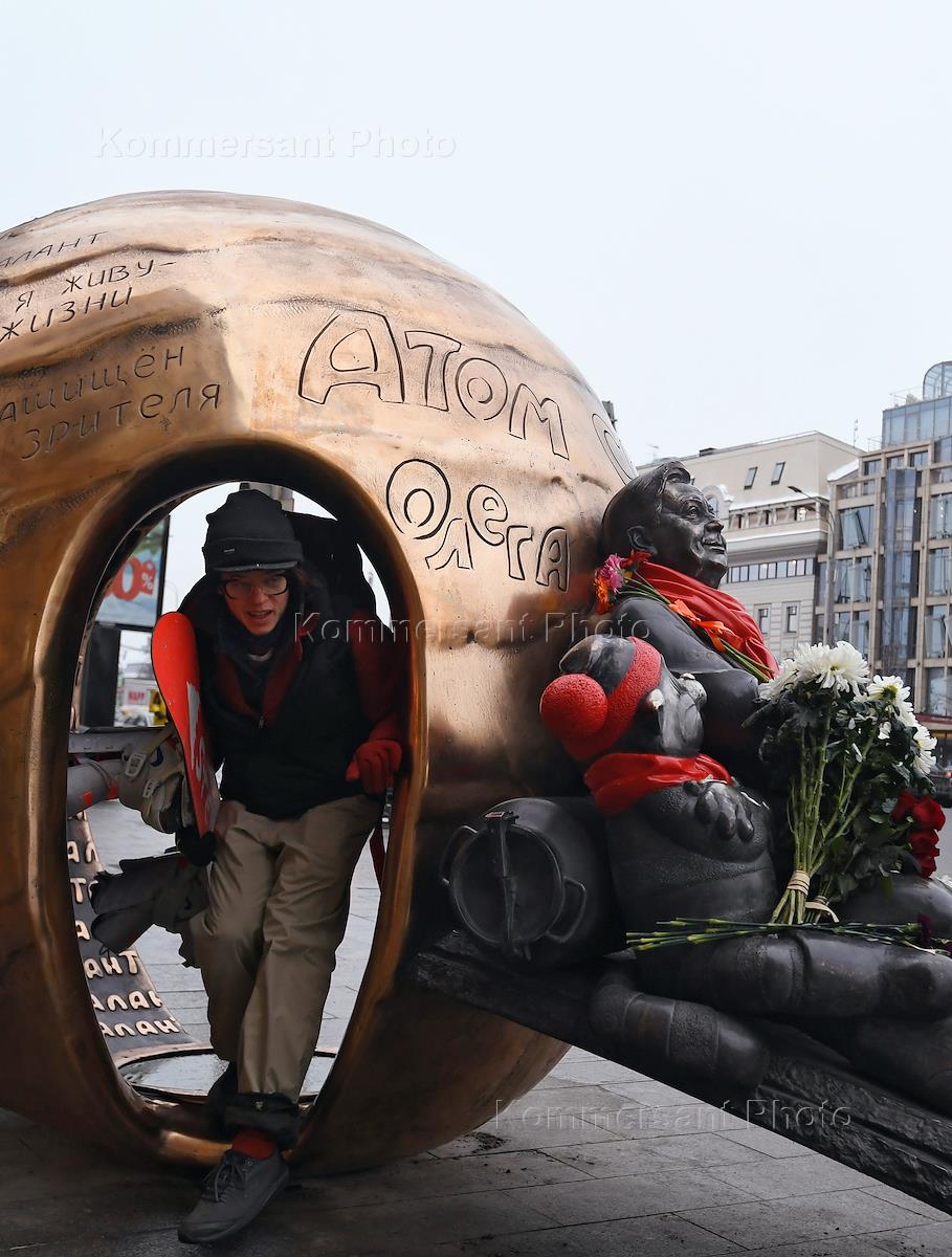 Церемония открытия скульптурной композиции "Атом Солнца Олега Табакова" скульптора Александра Рукавишникова, приуроченная к 85-летию со дня рождения художественного руководителя Московского художественного театра (МХТ) имени Чехова, артиста Олега Табакова, рядом с "Московским театром Олега Табакова" на Малой Сухаревской.