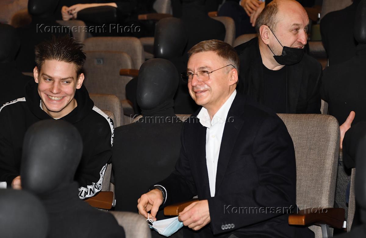 Церемония открытия скульптурной композиции "Атом Солнца Олега Табакова" скульптора Александра Рукавишникова, приуроченная к 85-летию со дня рождения артиста, Московском театре Олега Табакова. Слева направо: художественный руководитель Московского губернского театра, актер Сергей Безруков, художественный руководитель Государственного театра наций Евгений Миронов и художественный руководитель Московского театра Олега Табакова, актер, режиссер Владимир Машков на церемонии.