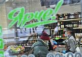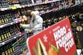 Жанровая фотография. Покупательница у прилавка с алкогольной продукцией в супермаркете.
