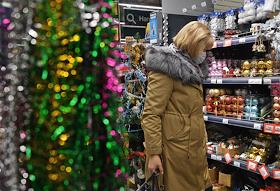 Жанровая фотография. Покупательница у прилавка с елочными украшениями в супермаркете.