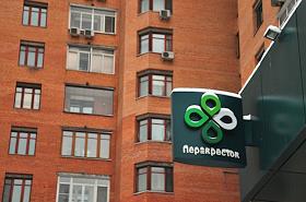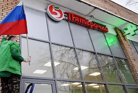 Жанровая фотография. Фасад здания с логотипами супермаркета "Пятерочка", аптеки и салона красоты.