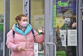 Жанровая фотография. Женщина в медицинской маске у входа в магазин "Ярче".
