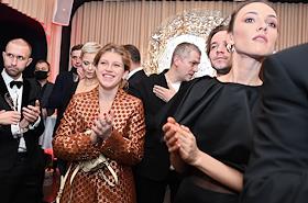 IX церемония вручения премии за достижения в области кино и телевидения "Событие года" журнала "КиноРепортер" в ресторане Yura. Актриса Мария Андреева (слева) и супруга актера Антона Хабарова фотограф Елена Хабарова (в центре) на церемонии.