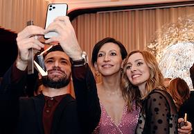 IX церемония вручения премии за достижения в области кино и телевидения "Событие года" журнала "КиноРепортер" в ресторане Yura. Слева направо: актеры Варвара Шмыкова, Роман Курцын и Александр Петров на церемонии.