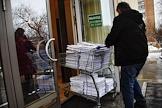 Пересмотр приговора участникам молодежной организации "Новое величие", осужденных за организацию экстремистского сообщества, в Московском городском суде. Жанровая фотография. Сотрудник суда с тележкой для перевозки папок уголовных дел.