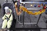 Заседание по уголовному делу в отношении муниципального депутата Москвы Юлии Галяминой в Тверском районном суде. Ситуация у здания суда. Жанровая фотография. Ребенок в детской коляске возле ограждений с новогодней мишурой.