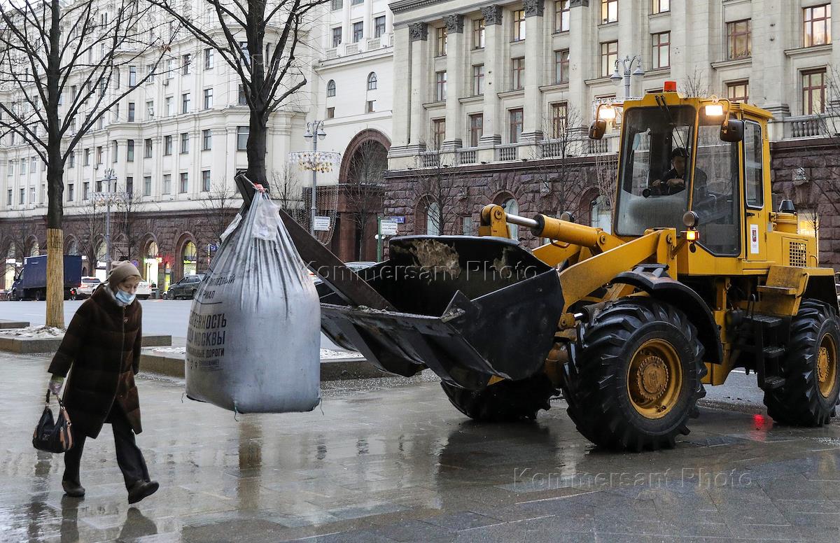 Виды Москвы. Жанровая фотография. Трактор с ковшом везет по тротуару мешок с антигололедным материалом.