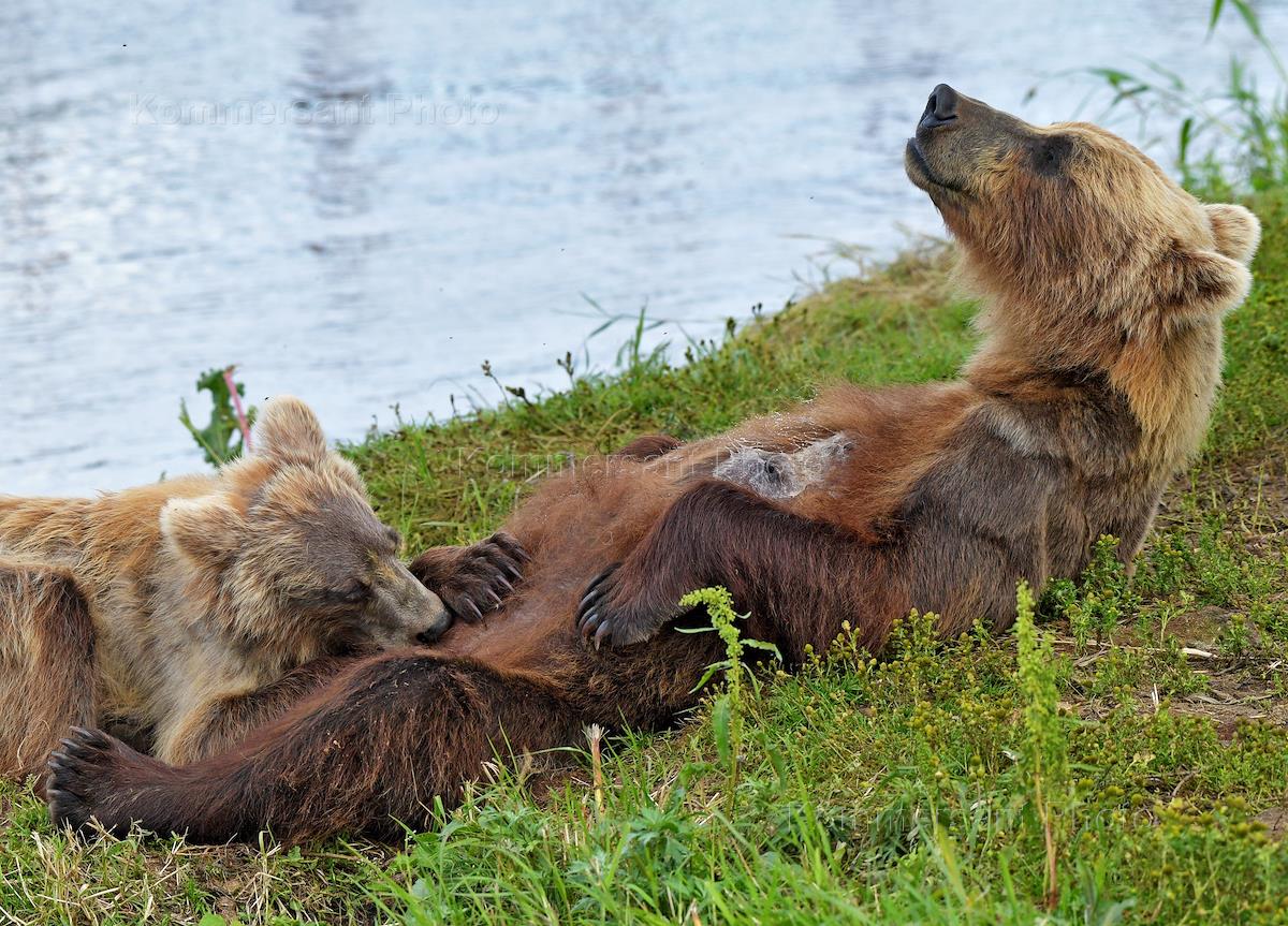 Южно-Камчатский федеральный заказник имени Т.И.Шпиленка. Жанровая фотография. Медведица с медвежатами на берегу озера.