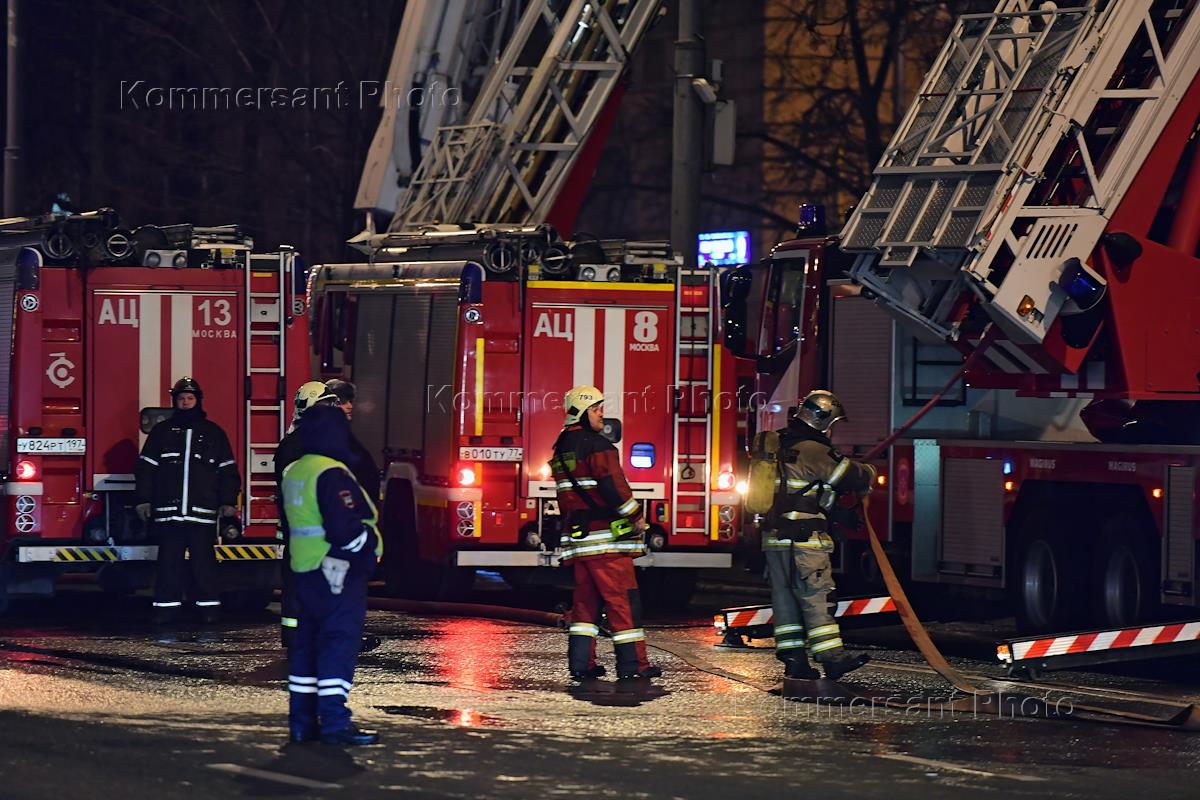 Пожар в здании "Мосгоргеотреста" на Ленинградском проспекте. Сотрудники пожарной службы МЧС России во время тушения пожара.