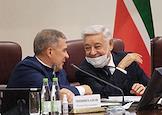 Совместное заседание организационного комитета по подготовке и проведению празднования 100-летия образования ТАССР, организационного комитета по подготовке и проведению в 2021 году в Республике Татарстан Года родных языков и народного единства и Совета по межнациональным и межконфессиональным отношениям. Президент Республики Татарстан Рустам Минниханов (слева) и председатель Государственного Совета Республики Татарстан Фарид Мухаметшин (справа) во время заседания.