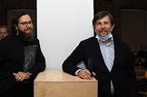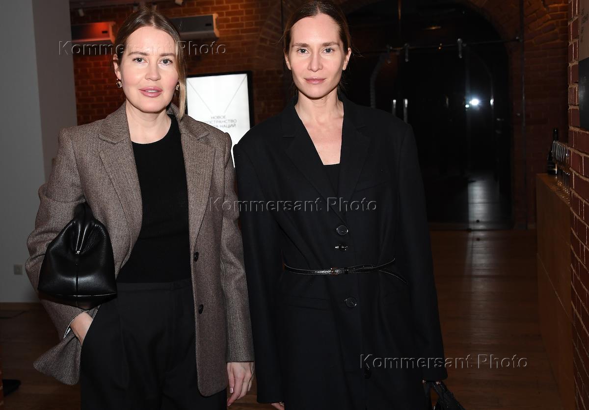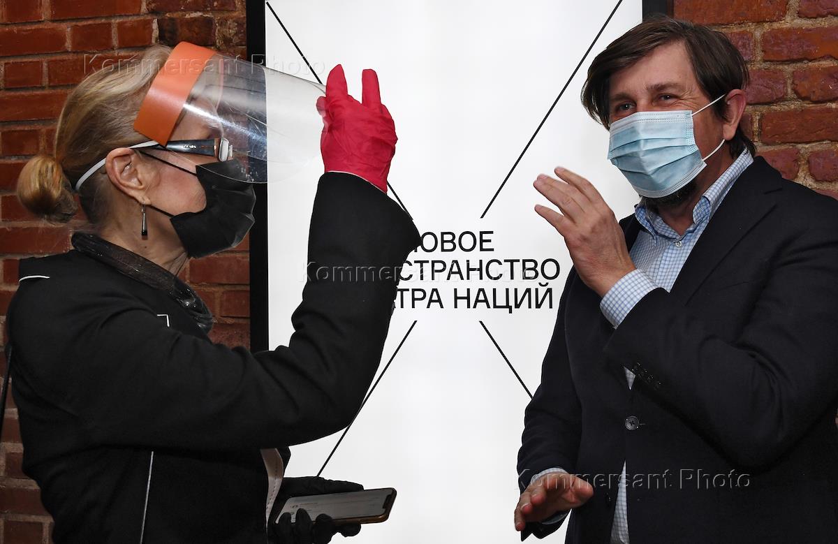 Специальный показ спектакля "7 дней в Совриске" на сцене нового пространства Театра Наций. Директор Мультимедиа Арт Музея Ольга Свиблова (слева) и актер, продюсер Андрей Фомин (справа) перед началом показа.