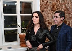 Специальный показ спектакля "7 дней в Совриске" на сцене нового пространства Театра Наций. Актер Дмитрий Лысенков (в центре) и его супруга, актриса Мария Зимина (слева) перед началом показа.