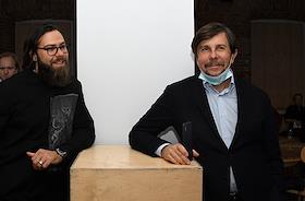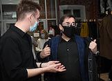 Специальный показ спектакля "7 дней в Совриске" на сцене нового пространства Театра Наций. Актер, продюсер Андрей Фомин (справа) и режиссер Олег Глушков (слева) перед началом показа.