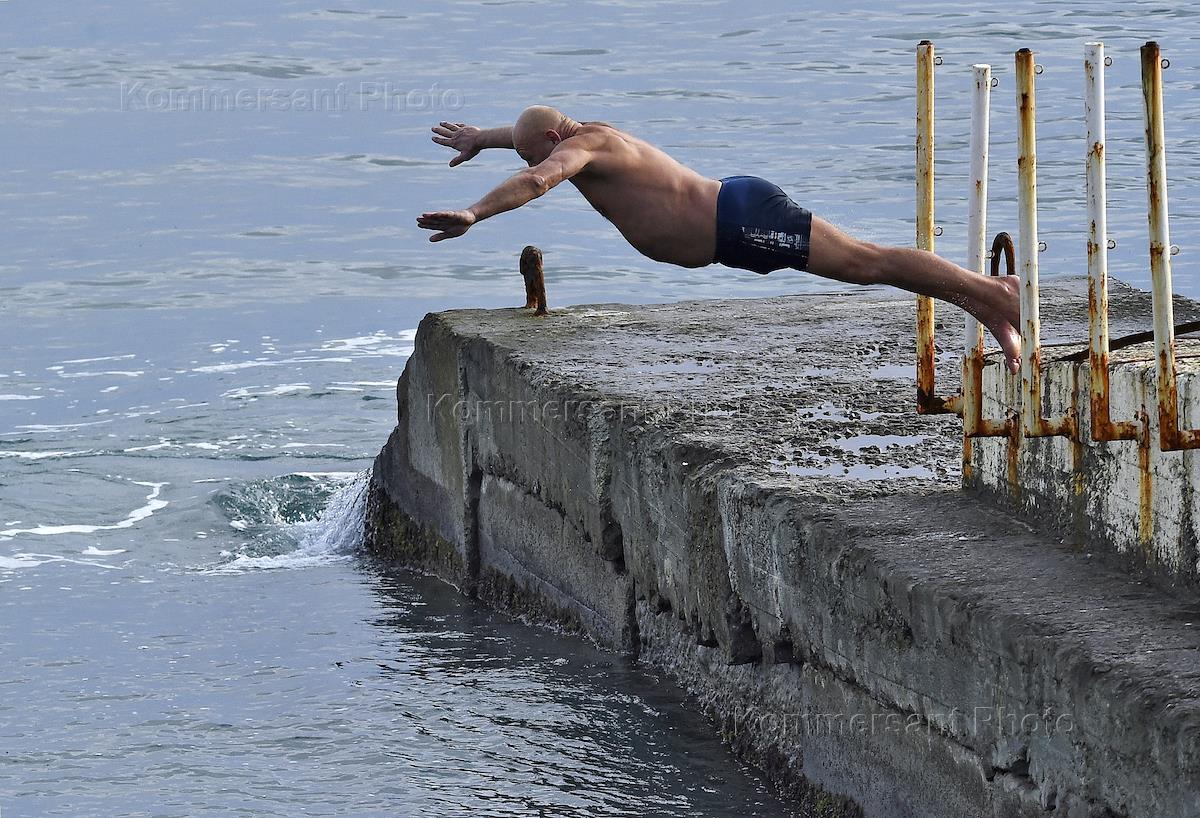 Жанровая фотография. Мужчина прыгает в море с пирса.