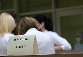 Вакцинация вакциной Гам-КОВИД-Вак ("Спутник V") врачей от коронавирусной инфекции COVID-19 в городской поликлинике №20 города Казани. Жанровая фотография. Табличка "Платные услуги" в регистратуре поликлиники.