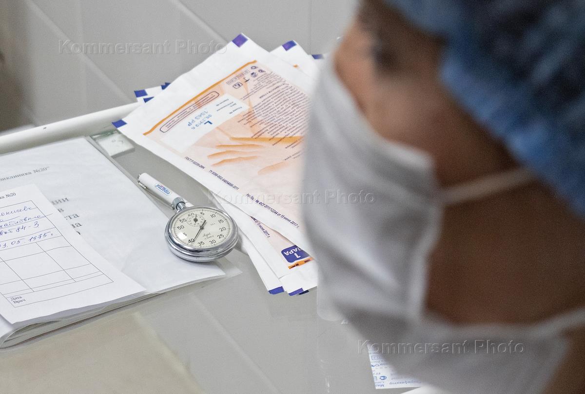 Вакцинация вакциной Гам-КОВИД-Вак ("Спутник V") врачей от коронавирусной инфекции COVID-19 в городской поликлинике №20 города Казани. Жанровая фотография. Забор крови на анализ перед вакцинацией.