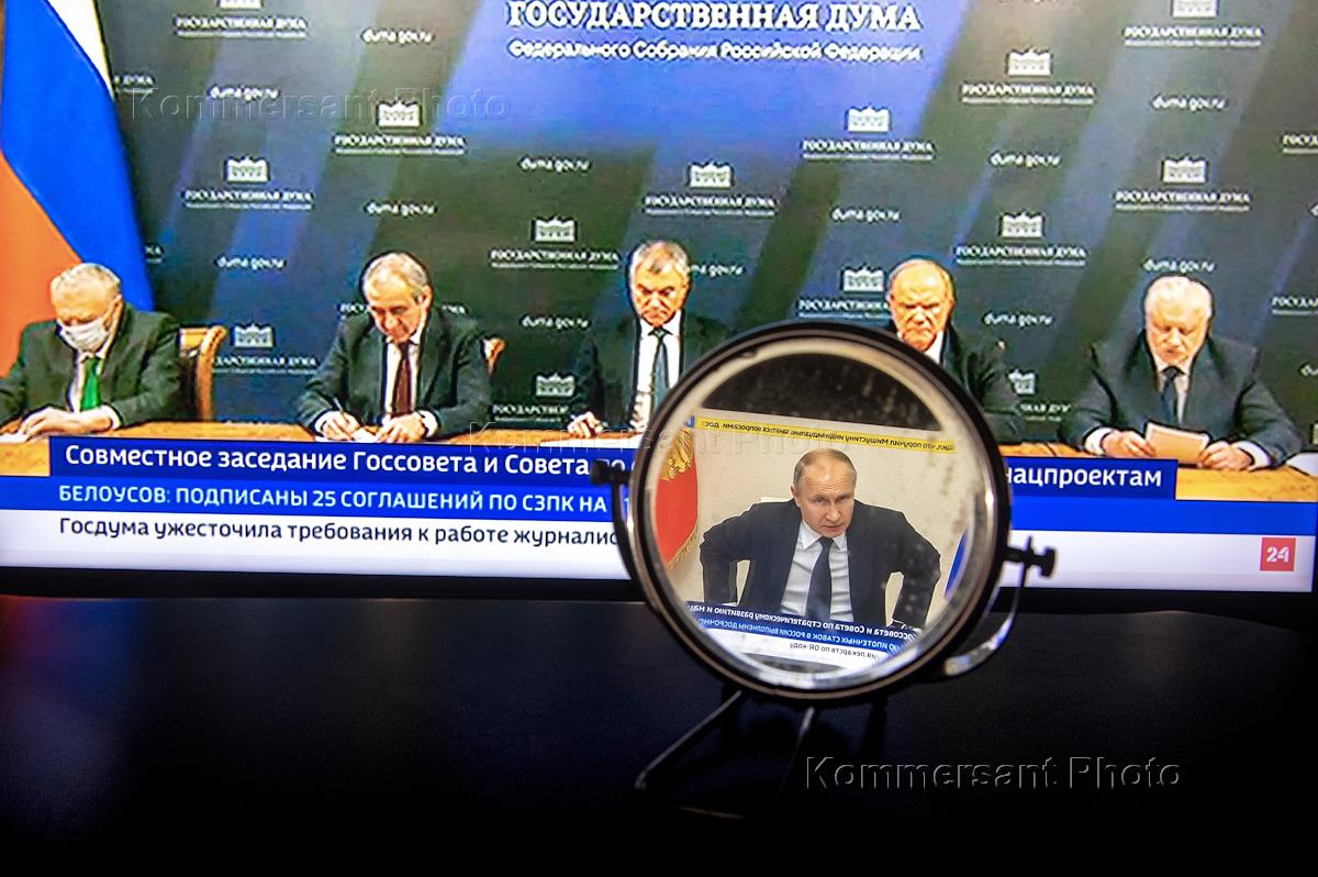 Жанровая фотография. Президент России Владимир Путин провел в режиме видеоконференции совместное заседание Государственного совета и Совета при президенте России по стратегическому развитию и национальным проектам. Трансляция заседания.