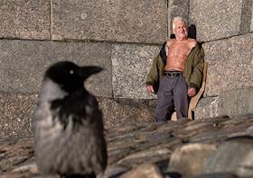 Виды Санкт-Петербурга. Жанровая фотография. Мужчина загорает у стены Петропавловской крепости.