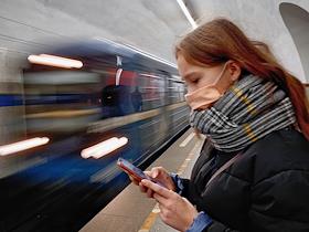 Виды Санкт-Петербурга. Жанровая фотография. Девушка в защитной медицинской маске с мобильным телефонам на станции метро "Фрунзенская" Петербургского метрополитена.