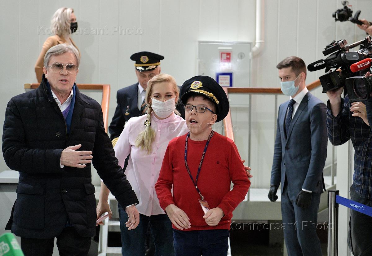 Министр транспорта России Виталий Савельев (слева) и мальчик Савелий Горелов из Одинцово Московской области (в центре) во время посещения Тренажерного комплекса Центра подготовки авиационного персонала (ЦПАП) ПАО "Аэрофлот"в рамках всероссийской благотворительной акции "Елка желаний" для детей, по разным причинам оказавшихся в непростой жизненной ситуации. Виталий Савельев помог осуществить мечту мальчика "полетать на авиатренажере".