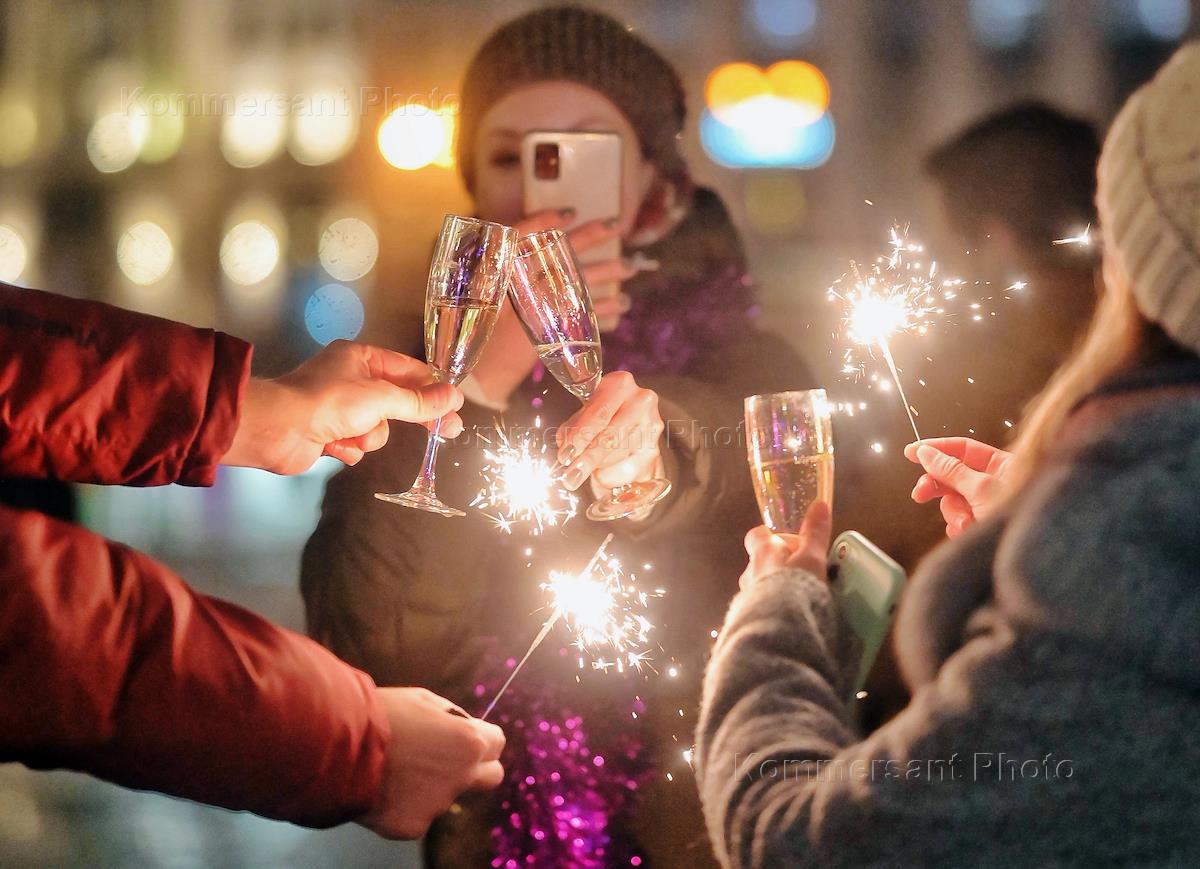 Жанровая фотография. Празднование нового года на улицах города. Люди с бокалами шампанского и бенгальскими огнями.