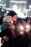 Жанровая фотография. Празднование нового года на улицах города. Молодые люди держат бенгальские свечи.