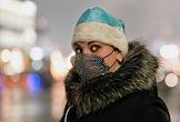 Жанровая фотография. Празднование нового года на улицах города. Девушка в защитной маске на лице.