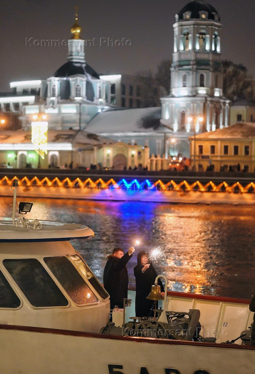 Жанровая фотография. Празднование нового года на улицах города. Люди с бенгальскими огнями на борту теплохода на Москва-реке.