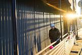 Жанровая фотография. Мужчина в строительной каске идет мимо реставрируемого здания на одной из московских улиц.
