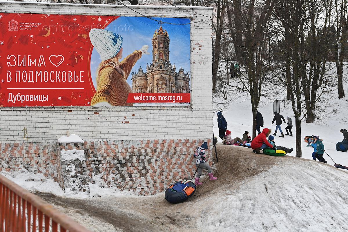 Жанровая фотография. Усадьба Дубровицы, храм Знамения Пресвятой Богородицы. Дети и родители катаются на санках.