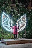Жанровая фотография. Виды Дмитрова. Станция Яхрома. Святящаяся инсталляция крылья ангела. Мужчина фотографируется у инсталляции.