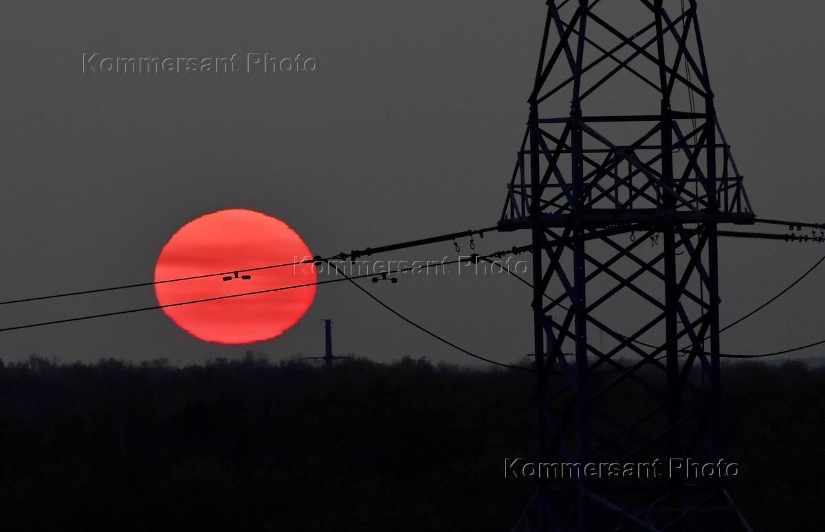 Сто лет "лампочке Ильича". Жанровая фотография. Красная луна и опора линии электропередачи (ЛЭП).