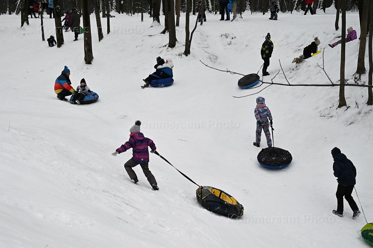 Виды Москвы. Жанровая фотография. Отдыхающие в парке Покровское-Стрешнево катаются с горы на тюбингах.