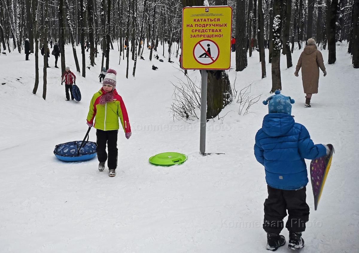 Виды Москвы. Жанровая фотография. Отдыхающие в парке Покровское-Стрешнево катаются с горы на тюбингах.