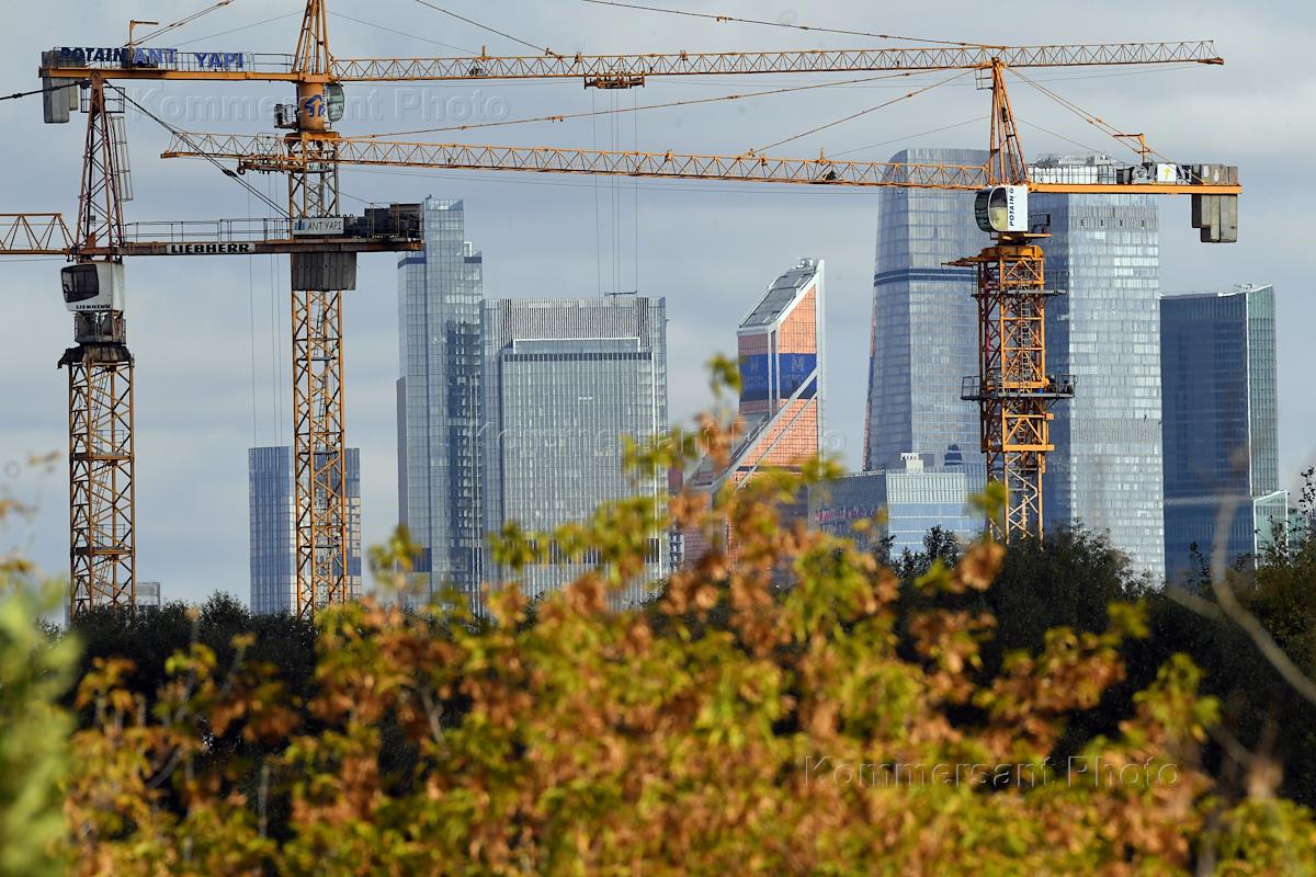 Views of Moscow. Genre photography. Construction cranes in front of the Moscow International Business Center "Moscow City".
