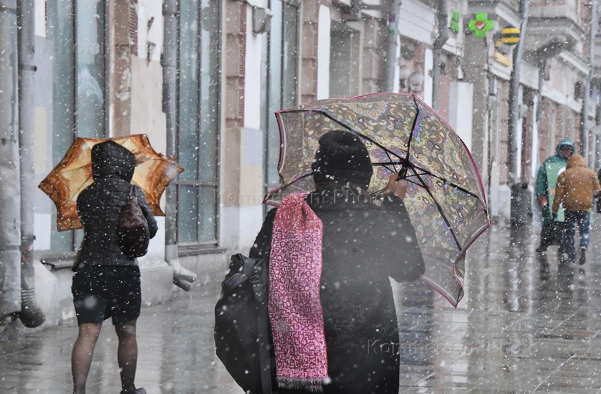 Виды Москвы во время снегопада. Жанровая фотография. Уборка снега на одной из улиц города.