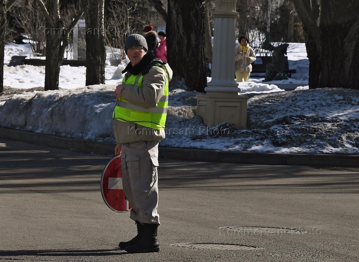 Жанровая фотография. Сотрудник дорожной службы в светоотражающем жилете с дорожным знаком в руках.