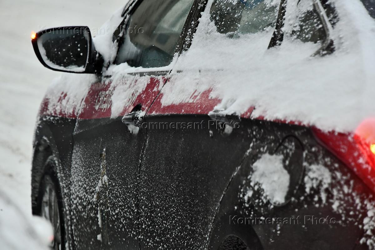 Виды Москвы. Жанровая фотография. Припаркованный автомобиль-такси компании "Ситимобил" на заснеженной улице.