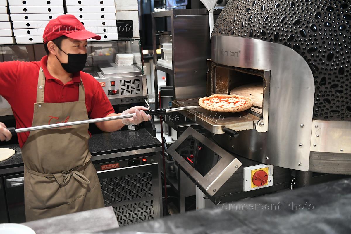 Жанровая фотография. Сотрудник пиццерии во время выпекания пиццы.