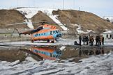 Последствия землетрясения в селе Тиличики. Вертолет МЧС на взлетной площадке в ожидании полета.