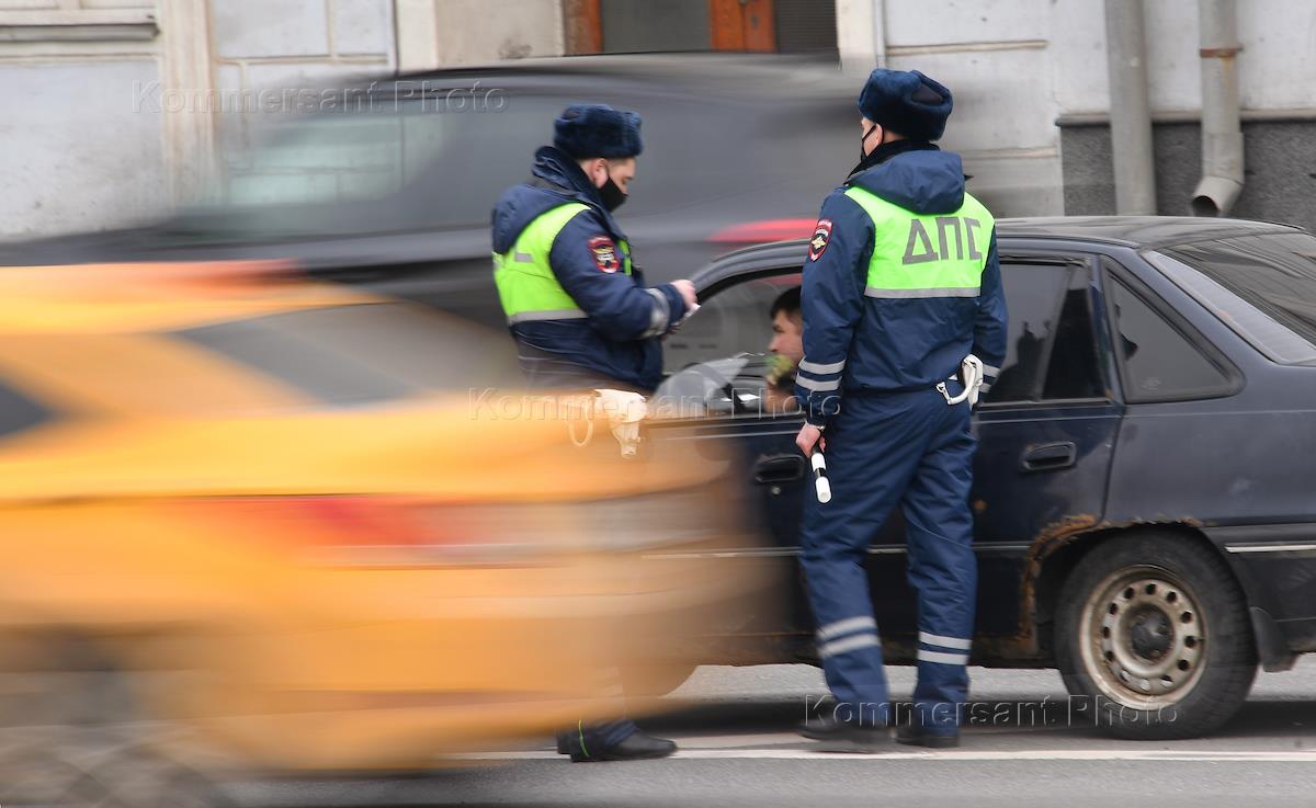 Жанровая фотография. Сотрудники дорожно-патрульной службы во время проверки документов у водителя автомобиля.