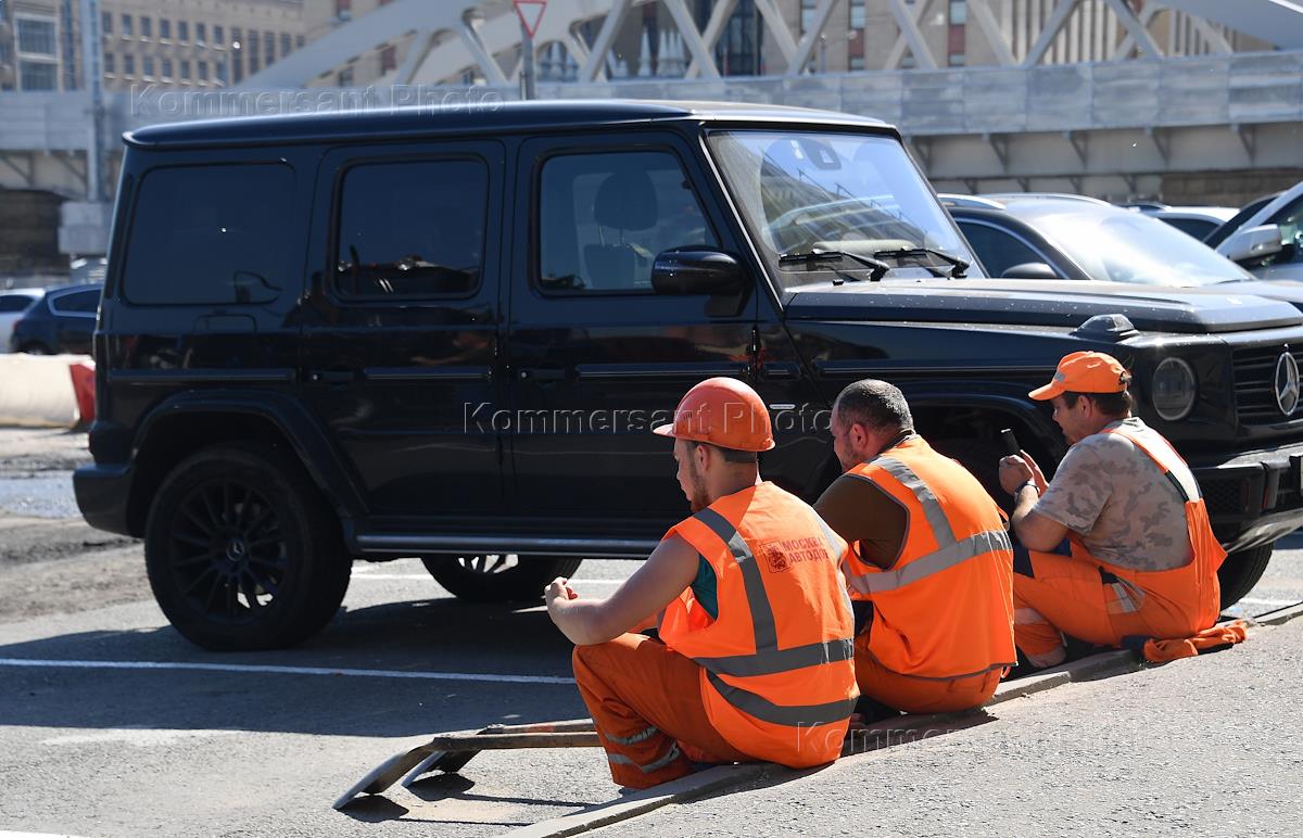 Виды Москвы. Жанровая фотография. Дорожные рабочие отдыхают на автомобильной парковке на Комсомольской площади.