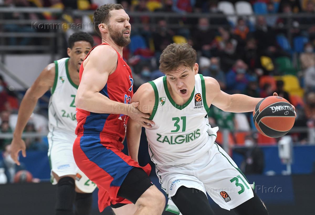 Евролига по баскетболу. Матч межу командами ЦСКА (Москва, Россия) - "Жальгирис" (Каунас, Литва) на стадионе "Мегаспорт". Игрок команды "Жальгирис" Рокас Йокубайтис (справа) во время матча.