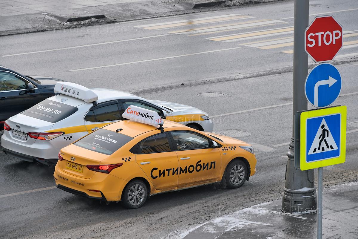Views of Moscow. Genre photography. Taxi cars of YandexTaxi and Citymobil services.