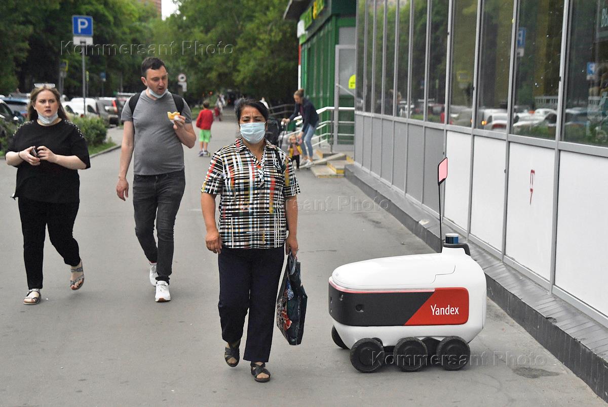 Views of Moscow. Genre photography. Delivery service "Yandex. Food" courier on a bicycle.