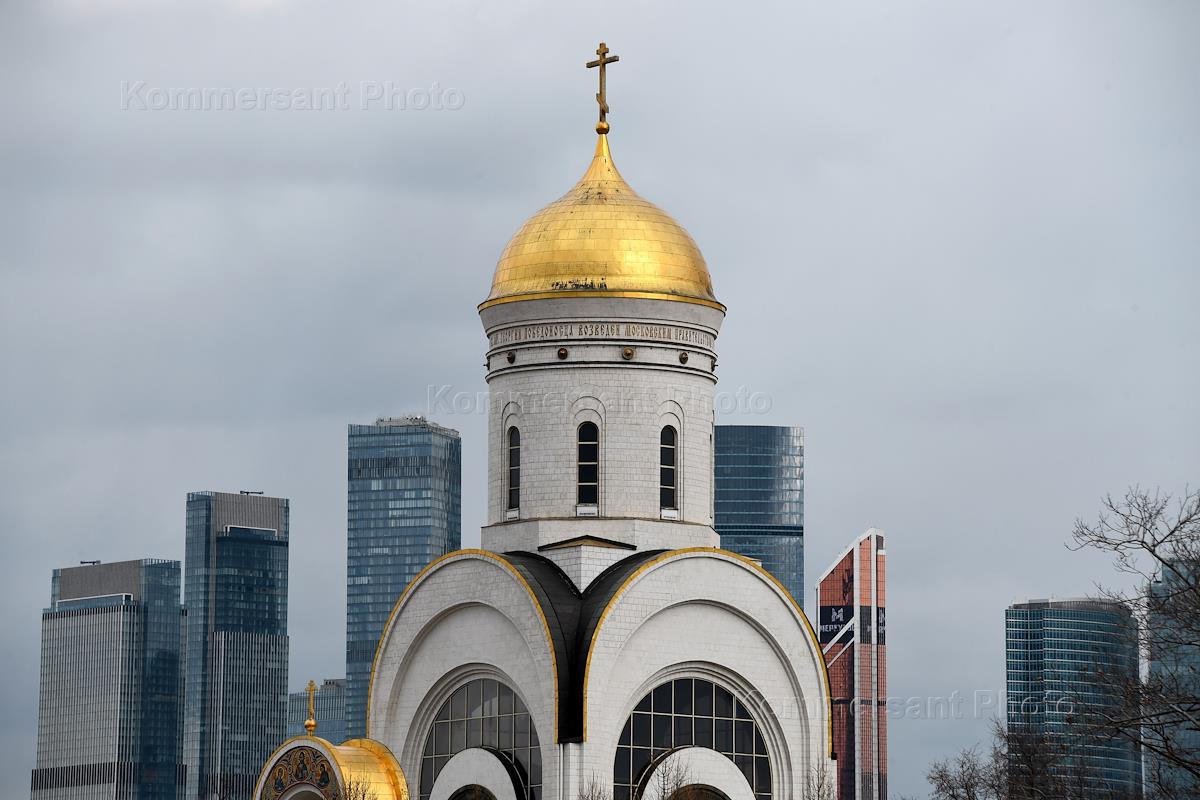 Genre photography. Orthodox crosses on the domes of the Church of the Great Martyr George the Victorious in Endova and ventilation pipes on the roof of the office building.