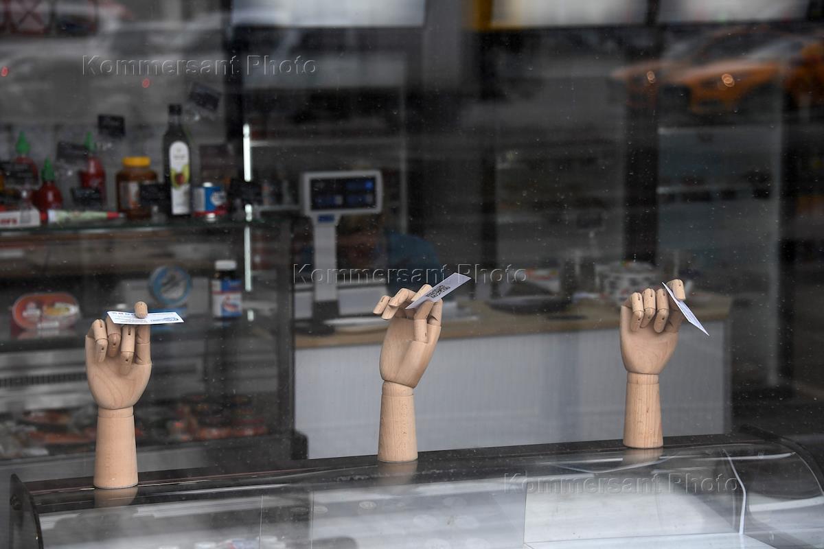 Moscow during the strengthening of measures to counter the spread of coronavirus infection COVID-19. Genre photography. Buyers and sellers in medical masks at the Afemall City mall.