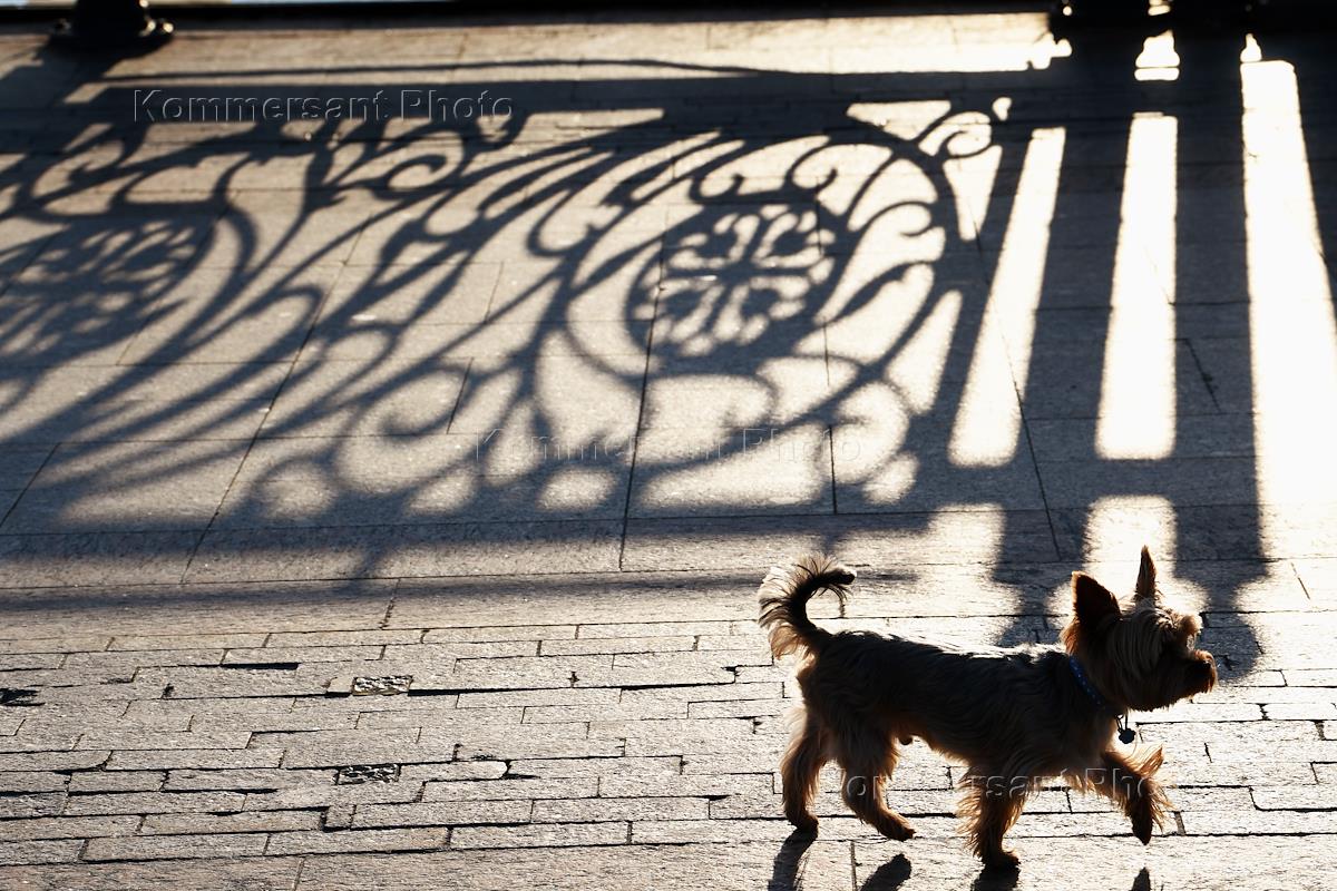 Виды Москвы. Жанровая фотография. Хозяин с собакой во время прогулки в сквере.